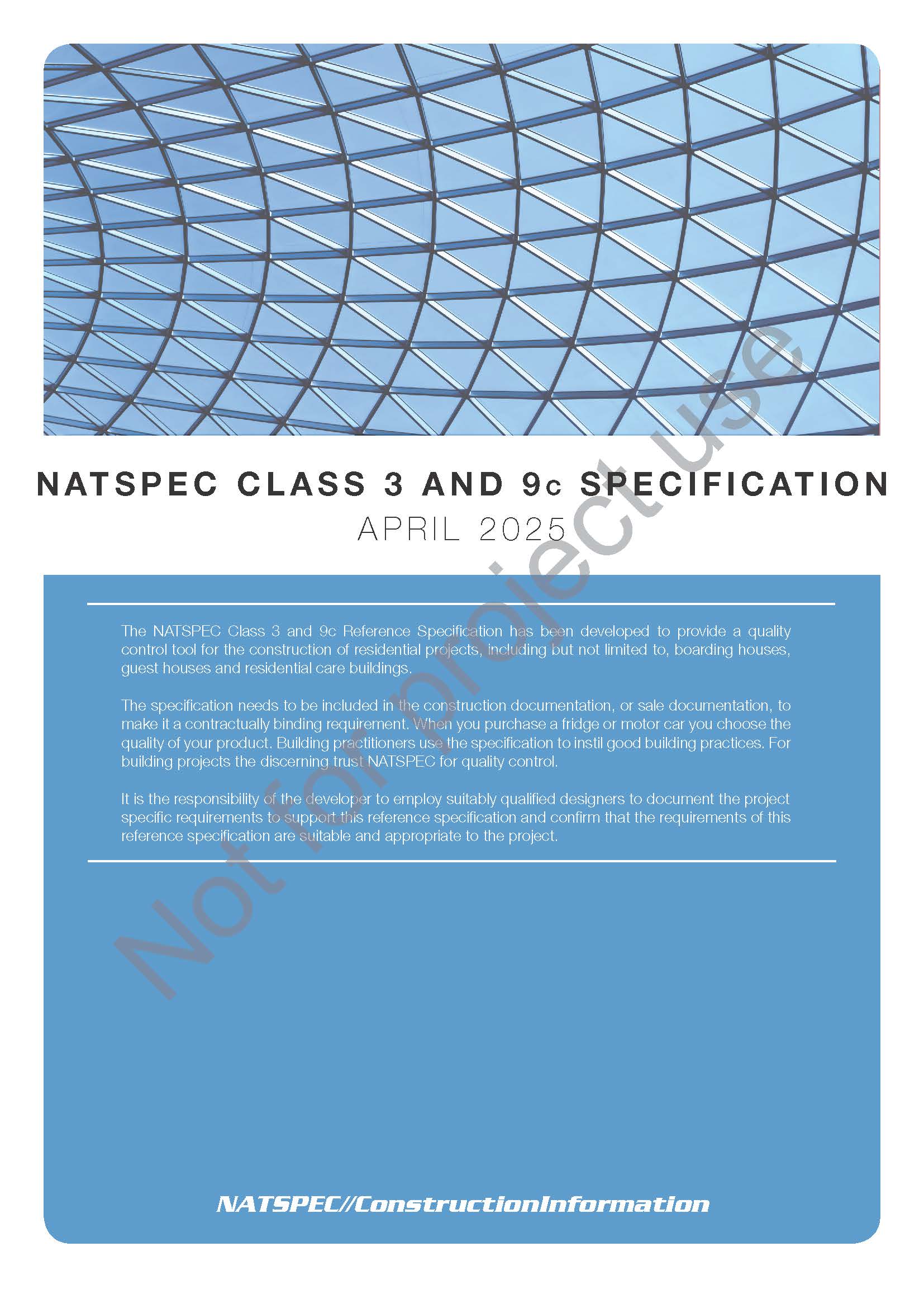 This Not For Project Use version of NATSPEC Class 3 and 9c Specification is available for purchase for information only and may not be used as a contract document for construction of a new Class 3 or 9c building. It will be watermarked ‘Not for project use’.